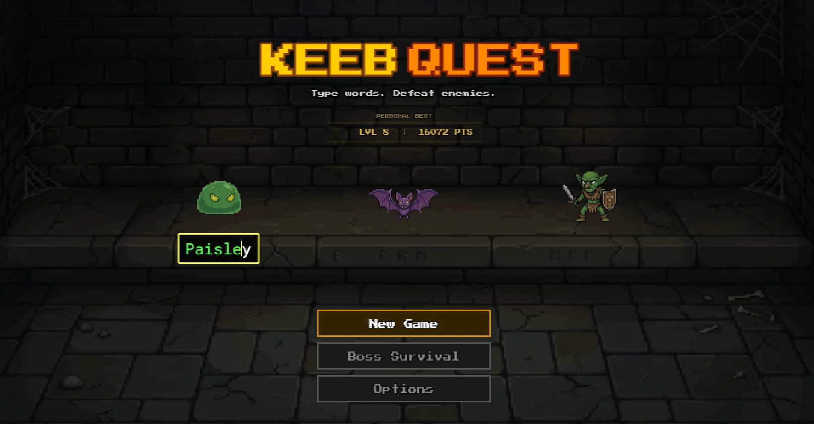Keeb Quest is a fast-paced typing RPG where your keyboard is your weapon. Enemies close in with every tick of their attack timer — type their words to stagger them before they strike. Build combos, fight bosses, and see how far your fingers can carry you.